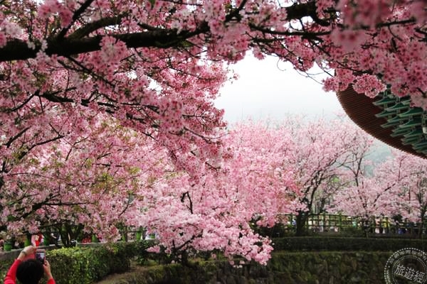 吉野櫻初開偏桃紅色,花瓣隨花開逐漸轉白,呈現淡淡的粉紅色,圍繞天元宮中式建築及環境氛圍內,再加上數大點點的吉野櫻爛漫綻放,宛如世外桃源的人間仙境!