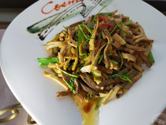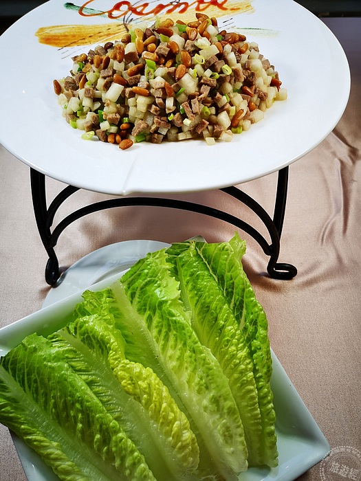 鴨胸料理三選一,菜色包括:香根爆炒鴨絲、松子香鴨鬆、香蔥鴨油菜飯,男生聚宴想吃飯才有飽足感,建議選用傳統江浙菜飯做法的「香蔥鴨油菜飯」,鴨油菜飯,先以鴨油熱鍋再加入開陽與紅蔥頭爆香,依序加入青江菜、鴨胸丁、白米、青蔥拌炒,再以大火收乾湯汁,菜香、鴨香完整滲透米飯,香味撲鼻而來,搭配鮮嫩的鴨胸丁,滋味嚐起來十分誘人。而女生相聚,想清爽品嚐,則不妨選用「松子香鴨鬆」,鴨胸肉切丁與清爽的涼薯(洋地瓜)、芹菜以及彩椒一塊拌炒,灑上金黃的油炸松子,香氣撲鼻十足誘人,鴨鬆底部則鋪上酥炸餛飩皮形成多層次口感,最後外層再以生菜包覆。入口的鴨鬆清爽且香氣迷人,尤其在松子的點綴下,更展層次。另外想味道重一些,則可選擇富有口感且鹹香味足的「香根爆炒鴨絲」!另外,鴨骨料理可四選一,包括:皮蛋煲鴨粥、鴨油炒時蔬、碧綠椒鹽櫻桃鴨、冬瓜筍片煲鴨湯!