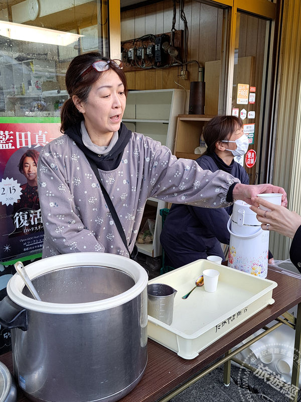 熱情店家準備溫暖甘酒熱飲提供「上り子」飲用暖身打氣。 ( 攝影 / 廖晨光 )
