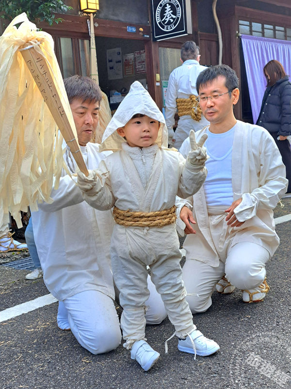 午後時分,「御燈祭」逐漸走入城市空間。來自各地「上り子」紛紛換上傳統白色祭裝,身著白色祭衣、腰綁粗麻繩,腳穿白布草鞋,手持尚未點火的五角形木製火把,虔誠恭敬寫上願望後,群集依序繞行新宮市街道,結隊參拜新宮市「阿須賀神社」、「熊野速玉大社」等神社。期間不少家庭三代同堂,老父親牽著年幼兒子的手,兩人都身著傳統白衣,在冬日的暖陽下漫步。