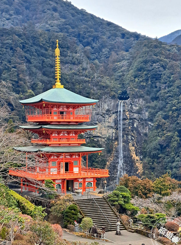 自「大門坂」拾級而上,循中邊路古道前行約2.7公里即可登頂參拜世界遺址「熊野三山」之「熊野那智大社」與相鄰的「青岸渡寺」。沿途杉木參天、石階覆苔,林蔭交織間瀰漫靜謐而莊嚴的氛圍。行至「青岸渡寺」旁,可見朱紅色的青岸渡寺三重塔矗立山腰,與後方自133公尺高處傾瀉而下的那智瀑布相互輝映。白瀑如練直落深潭,水霧繚繞山谷,與三重塔、蒼林構成熊野最具代表性的經典景觀。